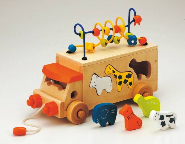 動物の型はめパーツと、ルーピングがセットになっているおもちゃです。すべてを収納して、車のひもを引っ張って遊ぶこともできます。ルーピングをひっくり返せば、蓋にもなります。いろいろな遊び方が考えられるので、お子さんの想像力を豊かにする遊びができるでしょう。