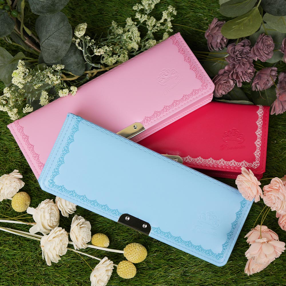 ティアラのロゴの型押しに繊細なレース刺繍が施された筆箱は、まるでプリンセスの宝箱のようなかわいらしさ。軽くて耐久性にすぐれたクラリーノ生地なので、長く愛用できそうです。鉛筆は上下合わせて13本収納できる大容量設計です。