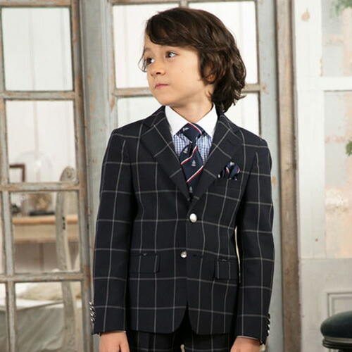 とがったピーク襟はフォーマル度が高いため、入学式の場によく似合います。スウェードの襟、エンブレムバッジ、ポケットチーフと、細部にまでおしゃれなこだわりが感じられますね。チェックのシャツもかわいいと好評です。