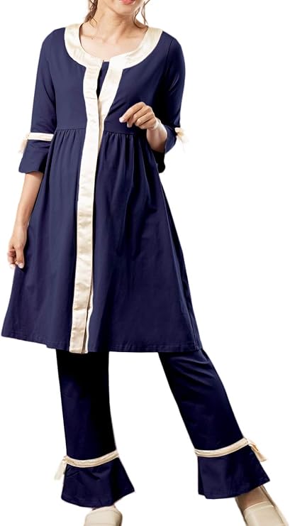 トップスは入院時に使いやすい長めの膝丈で、パンツの裾はフレアになっています。ボタンが隠れるフライ・フロント仕上げで、赤ちゃんにボタンが触れるのを防ぎます。タンクトップ型のレイヤーが付いているので、産院での授乳指導の際もお腹や胸元が目立たちにくいですよ。