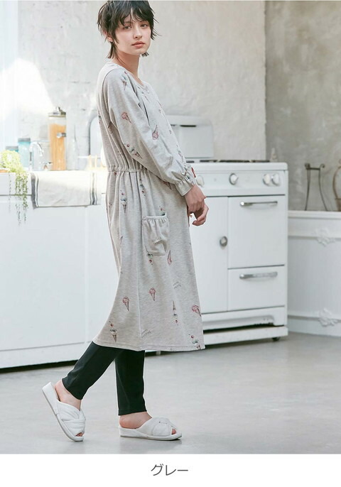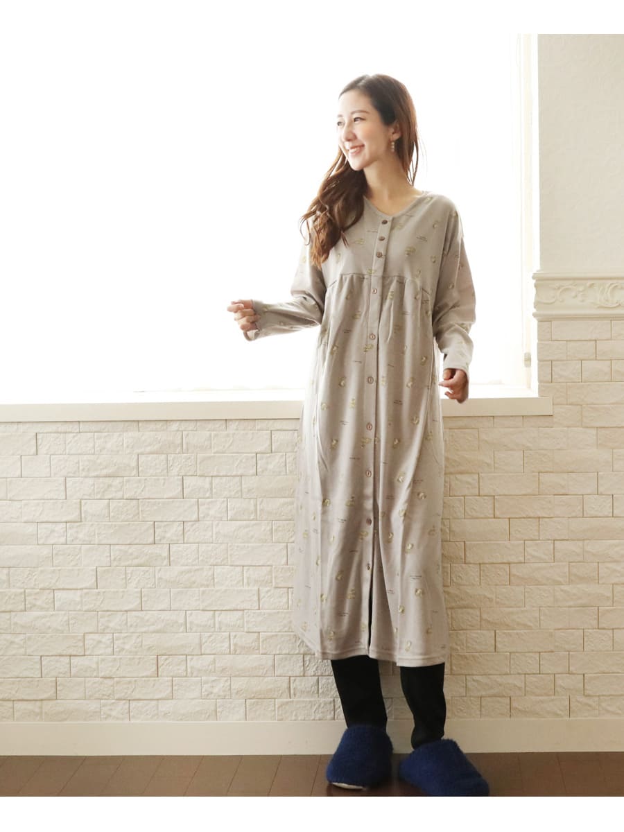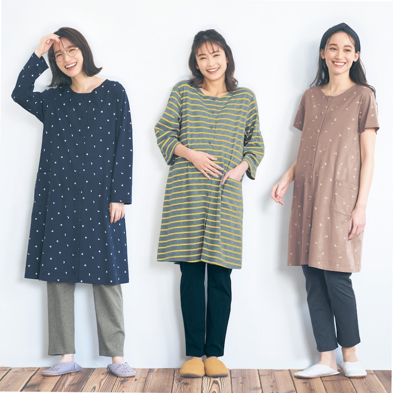 無地、花柄、ボーダー柄と、豊富なデザインがそろう人気のシリーズです。前開きタイプのトップスは、長めの丈でボトムスなしでも着られます。