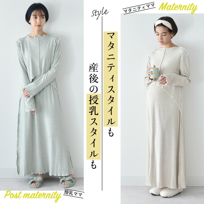 ウエストのかぶせをめくると授乳ケープに早変わりするおしゃれなマキシ丈のラウンジウェアです。パジャマにするのはもったいないほどデザイン性が高く、ワンマイルのおでかけならこの1枚で十分。産後ケア施設のルームウェアとしても採用されています。トレンドを意識して、袖丈も長めにつくられています。