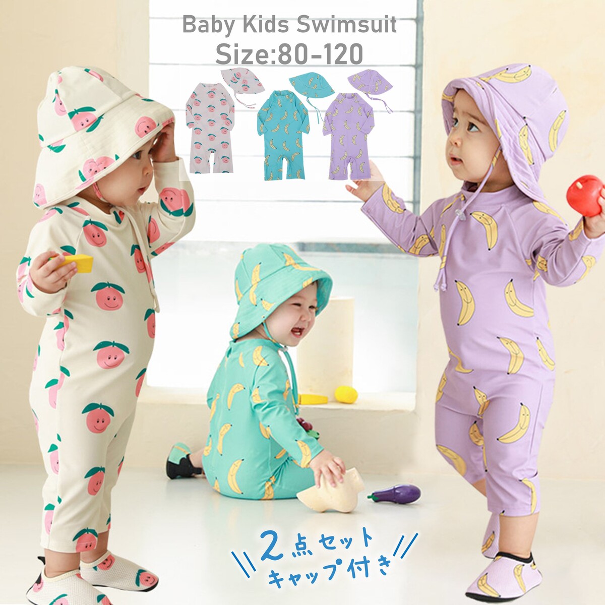 上下とも長袖仕様のロンパース水着です。肌の露出を抑えられるので、紫外線や虫が気になる季節でも安心して外遊びができますね。つばがついた帽子とセットになっています。