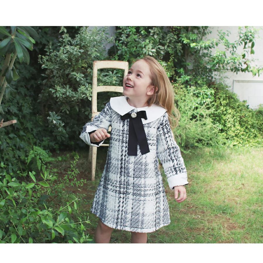 ジャケットを羽織るスタイルが多い中、周りと差をつけたい女の子におすすめなのが、清楚でかわいらしいワンピースです。モノトーンの落ち着いた色合いながらも、大柄のチェックが目を引くデザインです。襟と袖口の白に黒いリボンがアクセントとなり、おしゃれな印象に仕上がりますよ。