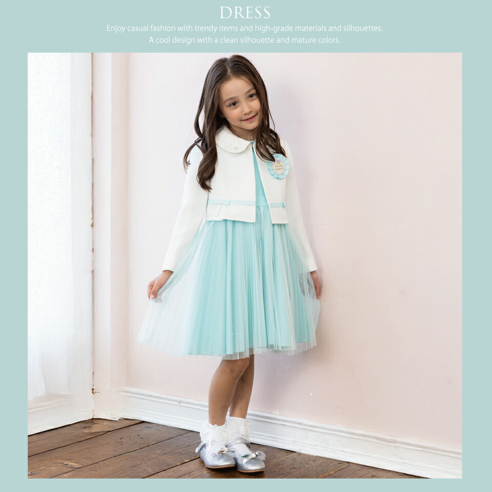 チュールプリーツ加工のワンピースとボレロジャケットのセットです。ボレロジャケットは襟付きで、上品な印象を与えます。ワンピースはウエストが切り替えになっていて、チュールの内側の下部スカートにはパールが飾りつけられています。明るく華やかな印象で、発表会にもおすすめです。