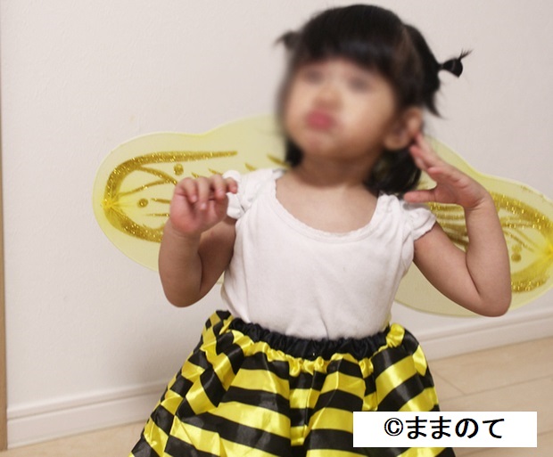 黄色と黒のボーダーで、かわいいみつばちに大変身です。背中の羽を大きめにすることで、後ろ姿だけでなく前から見た姿も豪華に見えますね。みつばちなどの虫のコスチュームにするときは、触覚風のカチューシャを着けたり、アスタイルを上部でふたつのお団子にしたりすると、よりクオリティーの高いハロウィンスタイルになりますよ。