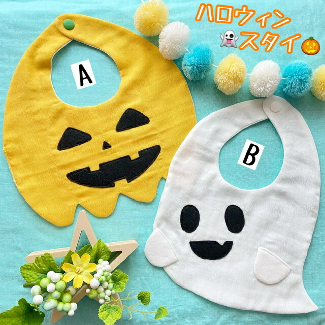 大きなかぼちゃのスタイは、遠くからでもひと目でハロウィンとわかりますね。かぼちゃのおばけは目や口が真っ黒なものが多く、赤ちゃんによっては怖がることもありますが、こちらはにっこり微笑んだ優しい表情なので、赤ちゃんにぴったりですよ。