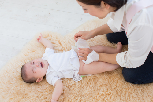 男の子の場合、おむつ替えの際におしっこが飛びやすいので、コットンやタオル、おしりふきなどをおちんちんにかぶせておくのがおすすめです。また、おむつを着ける際は、漏れを防ぐためにおちんちんを下に向けておきましょう。