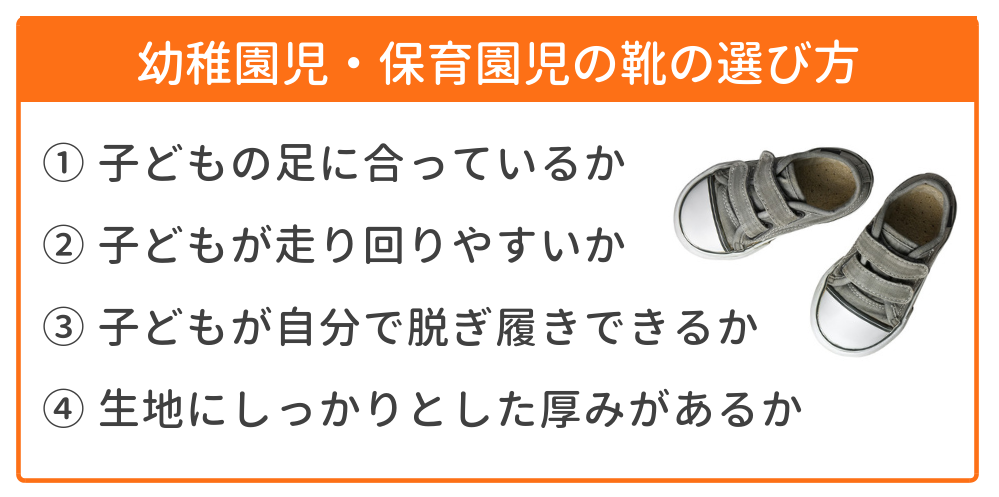 また、子どもが遊んでいるときに、お友だちに足を踏まれたり上からものが落ちてきたりすることがあります。衝撃から足をガードするためにも、しっかりとした厚みのある生地が使われている靴を選んでくださいね。