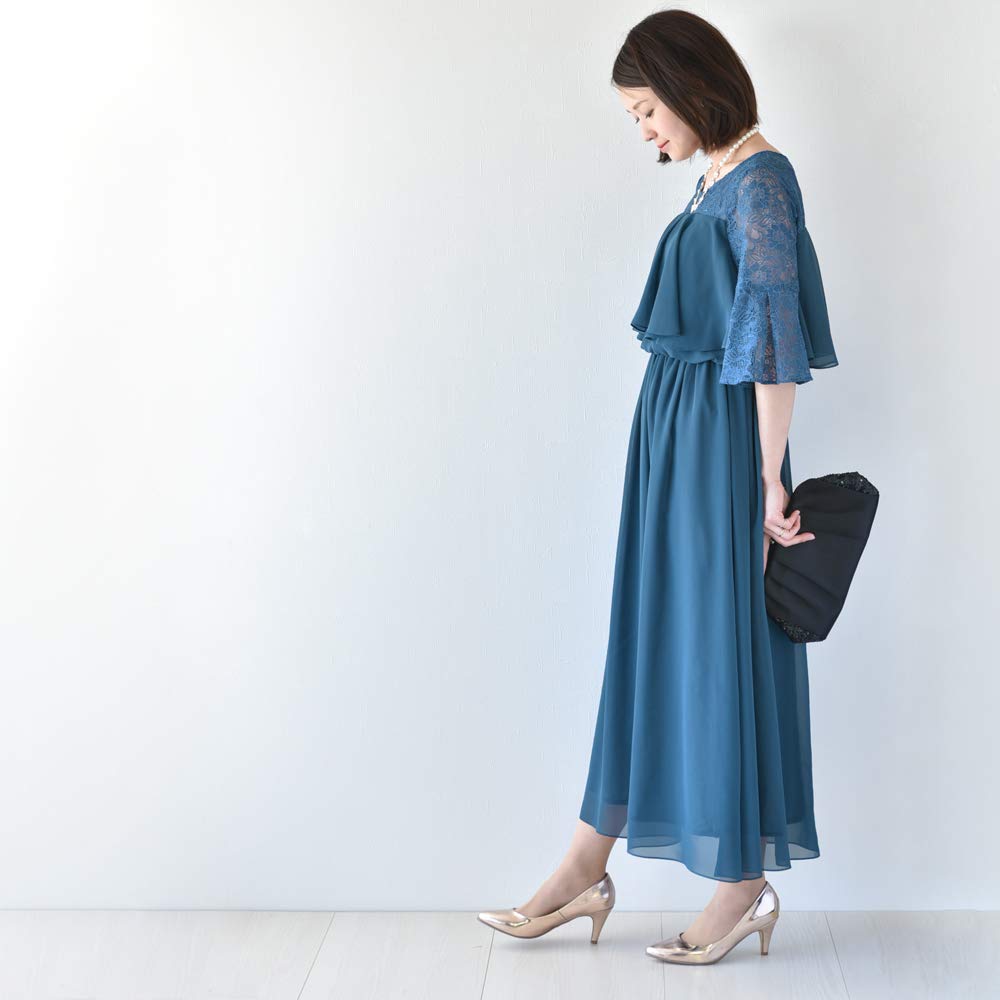ポイントになるレース袖は「ベルスリーブ」「カフス5分袖」「カフス9分袖」と三種類あるので、愛らしく見せることも大人っぽくすることもできます。すとんとしたシンプルなシルエットですが、気になる二の腕やお腹を目立たせず、上品に見せてくれますよ。結婚式やお宮参りなど、幅広い場面で活躍しそうですね。