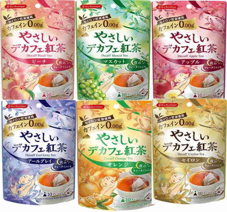 市販のデカフェ紅茶で見かけることが多い商品のひとつである「やさしいデカフェ」シリーズが、6個セットになった商品です。やさしいデカフェ紅茶シリーズには、レモン・アップル・アールグレイ・ピーチ・マスカット・セイロンなどがあります。さまざまなものを試して、好みのものを見つけてみましょう。