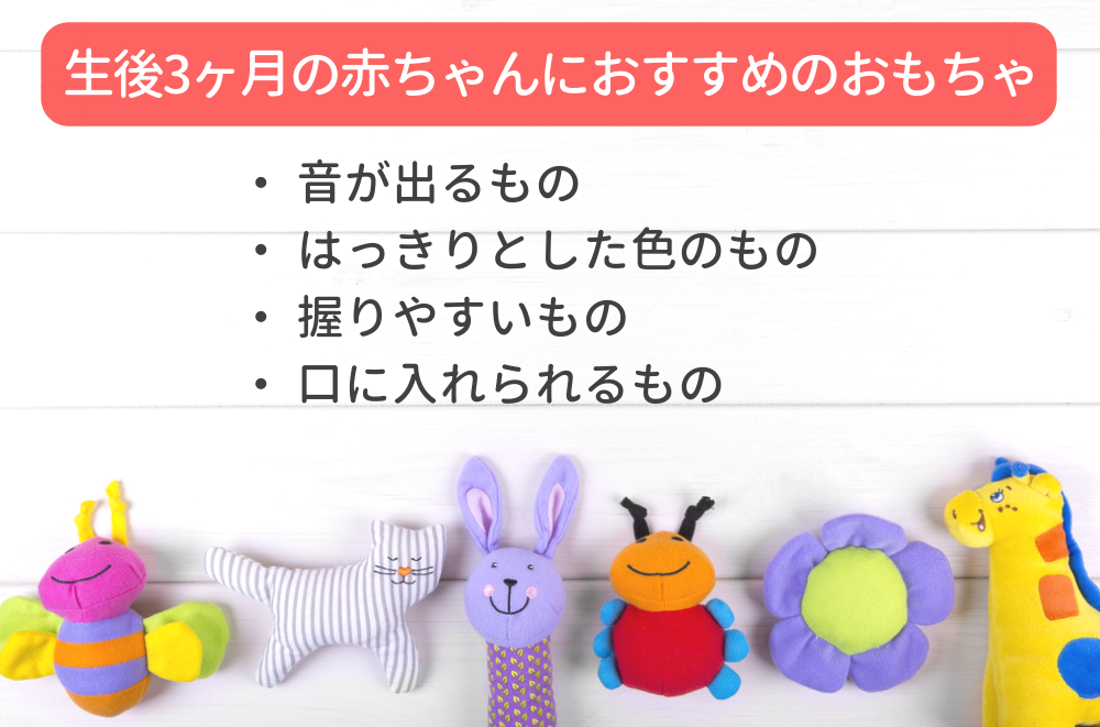 生後3ヶ月ごろの赤ちゃんはどのようなおもちゃで遊ばせるのが良いでしょうか。おもちゃ選びのポイントを説明します。