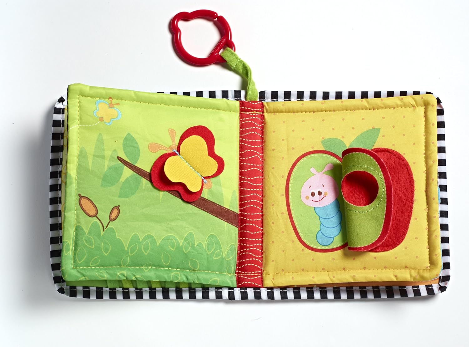 おでかけに便利なフックがついた布絵本です。赤ちゃんでも認識できるカラフルな色遣いや、楽しいしかけが詰まっています。てんとうむしやハチ、ちょうちょうなど、かわいいキャラクターがたくさん登場しますよ。