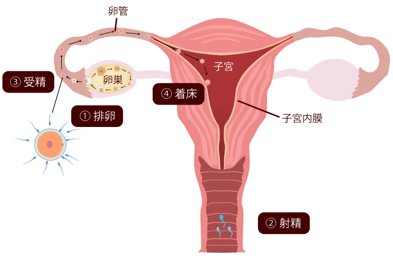 女性の身体の中では、女性ホルモンの働きにより、およそ月1回の割合で卵巣から成熟した卵子が飛び出します。これを排卵といいます。排卵された卵子が精子と出会い受精卵となり、子宮内膜に着床すると妊娠が成立します。
