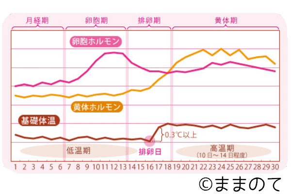 正常な生理周期では、排卵が起こると基礎体温が0.3~0.5℃上昇します。基礎体温が上がるのは、プロゲステロンに体温を上昇させる作用があるからです。プロゲステロンは排卵後に卵胞が変化した「黄体」から分泌されます。そのため、排卵後の黄体期に体温が高くなるのです。