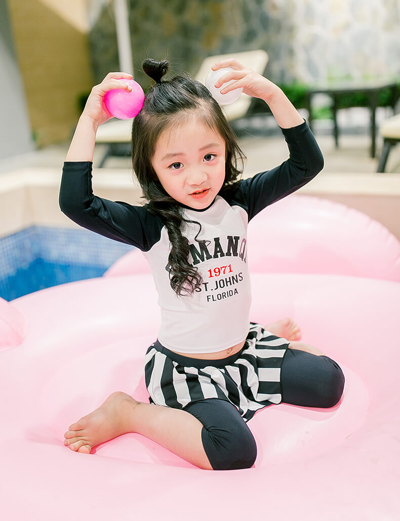 おしゃれな幾何学模様やアルファベットがポイントのラッシュガ―ドセットです。レギンス付きなので、紫外線やけがから足をしっかり守ってくれます。ブラックとホワイトの2色があるため、きょうだいコーデにもおすすめですよ。