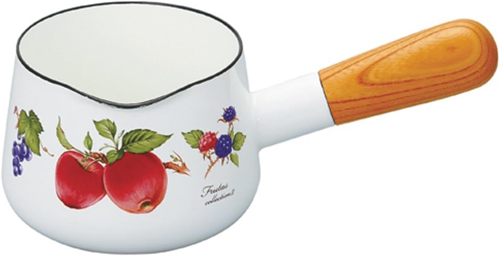 こちらの小さなミルクパンは、70年近くホーロー作りを手がけている「富士ホーロー」製です。中身を移しやすい注ぎ口や、握りやすい木製のハンドルが安全で使い勝手が良いと評判です。クラシカルな雰囲気の絵柄が特徴で、両手鍋や保存容器もシリーズでそろえたくなるかわいさです。