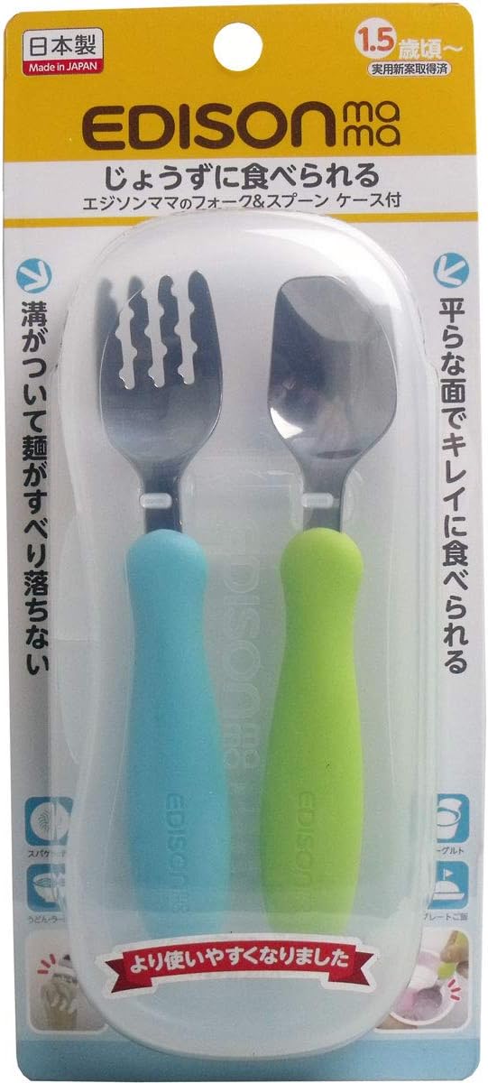 持ち手部分が小さな子どもが握りやすい形になっていて、我が家はエジソンのスプーンとフォークにしてから、積極的に自分から持って食べるようになりました。フォークの先端部には溝がついており、麺などを刺すと滑り落ちないよう工夫されています。また、スプーンは先が平らになっていてお皿の面にフィットして食べ物をきれいにすくうことができます。食洗器にも対応していて、ステンレス製なので衛生面も安心です。ケースも付いているので外出時にも大活躍ですよ。