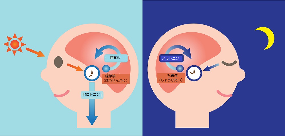 人間は、太陽の光を浴びることで睡眠を誘うセロトニンというホルモンが分泌されるといわれています。また、起きてから意欲的に活動することも、セロトニンの分泌を促すことに効果的です。