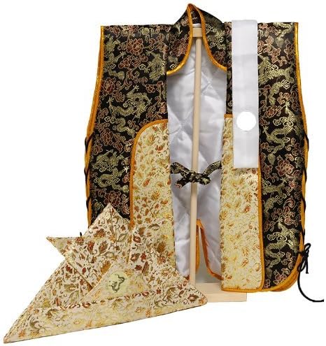 自宅で初節句の撮影をする場合、陣羽織を用意すると雰囲気のある写真が撮れるのではないでしょうか。こちらは陣羽織と兜のセットです。生地がしっかりとして、きらびやかな金色が映え写真に生えます。スタンド付きなので、着ないときは兜の横に飾れます。