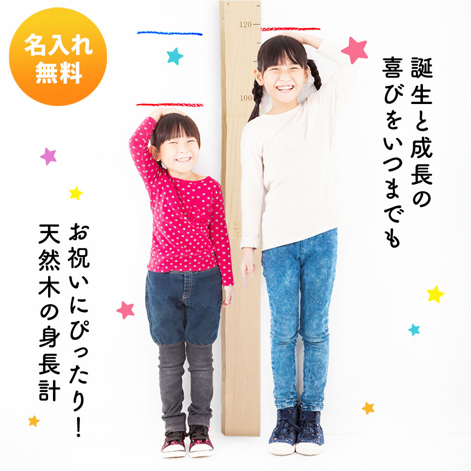 最大3人までの名入れができる天然目の身長計です。名入れ加工では、子どもが生まれたときの生年月日、身長、体重を刻みます。木製の身長計は家の中に温かみを届けてくれるでしょう。