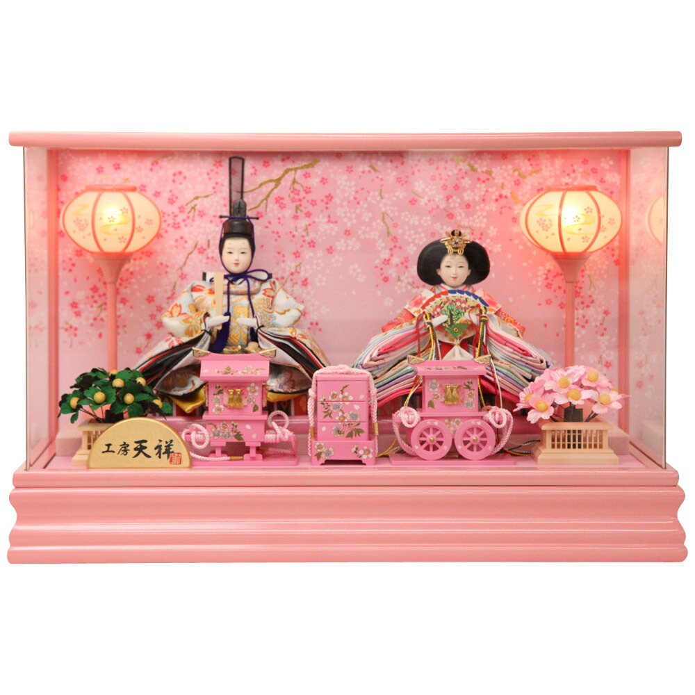 女の子が好みやすい桃色を基調とした雛人形です。桜の花びらや木が描かれたケースが、華やかな雰囲気を盛り上げてくれるでしょう。