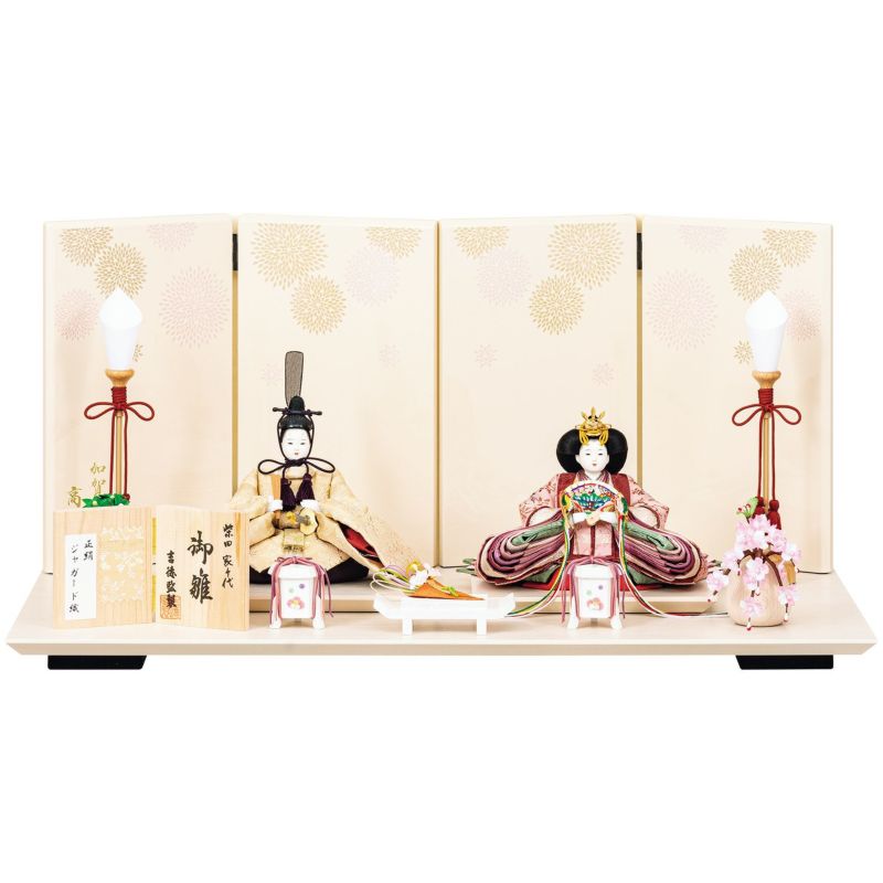 作家の柴田家千代が手掛けた収納飾りは、かわいらしいお顔と裾のシルエットが長く美しいのが特徴です。現代のお部屋にもあうシンプルでモダンなつくりながら、白色屏風には吉祥文様である「紗綾形文様(さやがたもんよう)」が入るなど、細部までこだわりが生きています。比較的コンパクトなため、飾るスペースや収納場所が限られている家庭にもおすすめですよ。