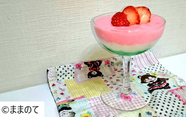 4.透明のうつわに、緑→白→ピンクと色の付けたフルーチェを重ね、上にイチゴなどをトッピングしてできあがり