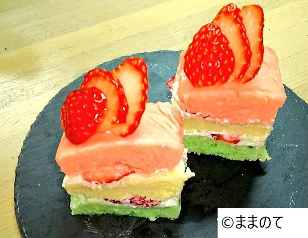 4.生地が冷めたら、生クリームやフルーツをはさみ、緑・白・赤の順に重ねてできあがり