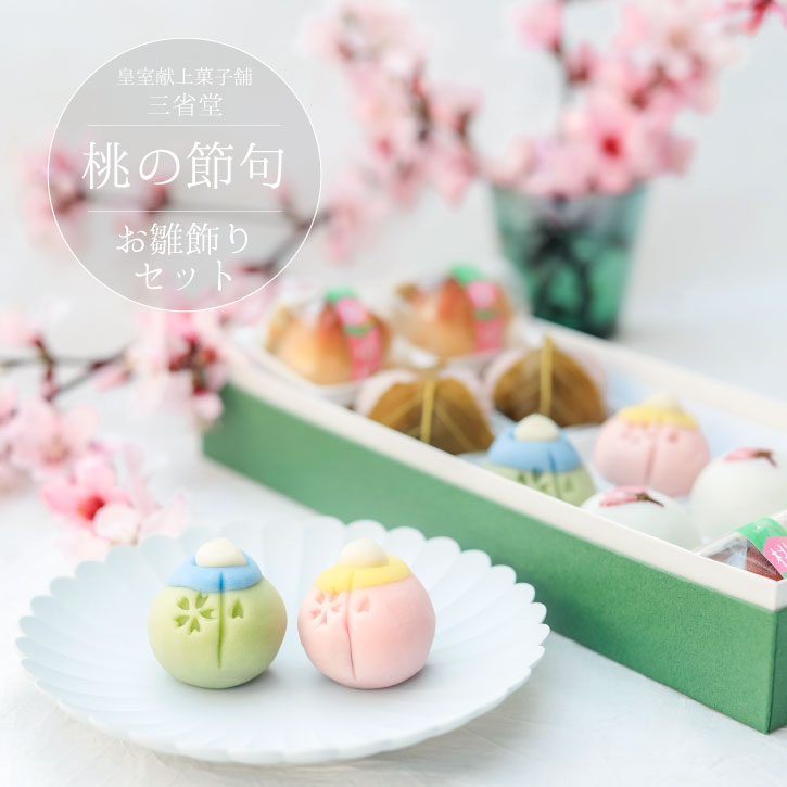 練りきりでつくられたお内裏様とお雛様、道明寺、さくらの上用饅頭、桃ゆめの詰め合わせです。皇室献上菓匠である三省堂は、創業100年を迎える老舗。伝統的な製法と独創的な発想でつくられた和菓子は、子どもの成長と発展を願うお祝いの席にふさわしいですね。