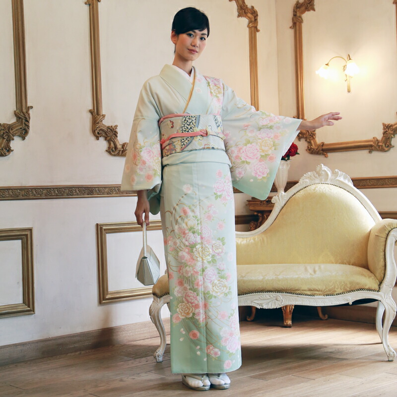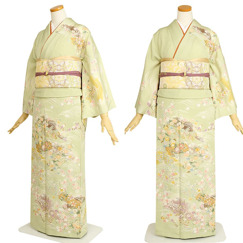 淡い色の着物の中でも、若草色は幅広い年代で着られるため人気があります。四季の草花や花車などが華やかに描かれ、気品を感じさせます。正統派の柄で品良く着こなしたい人におすすめです。