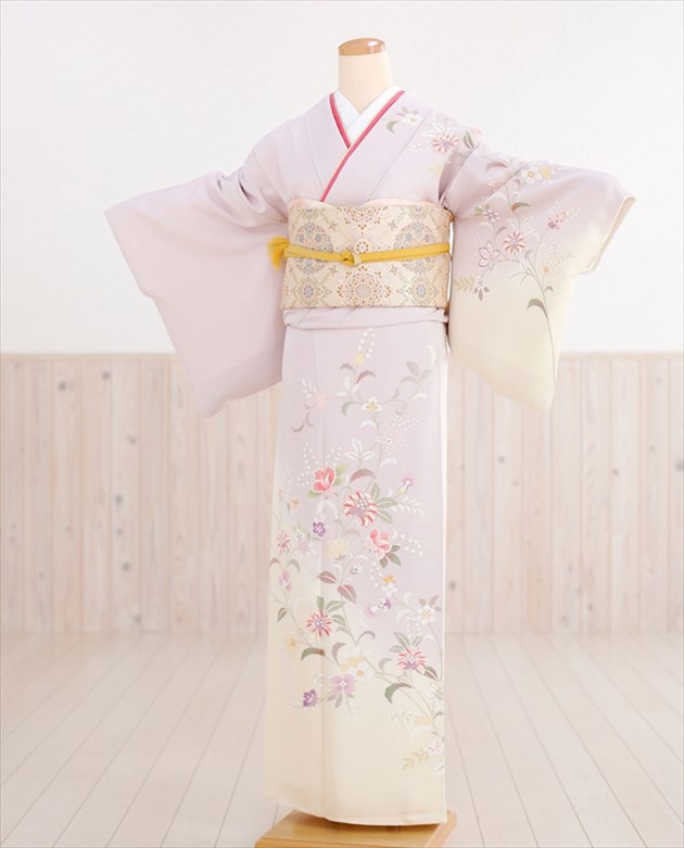 淡い紫の地に花模様が入った訪問着です。主張し過ぎない柄とやさしい色が好印象ですね。プロデュースしているのはあの松田聖子さんです。華やかながらも落ち着いた印象を与える着物を探している人におすすめです。