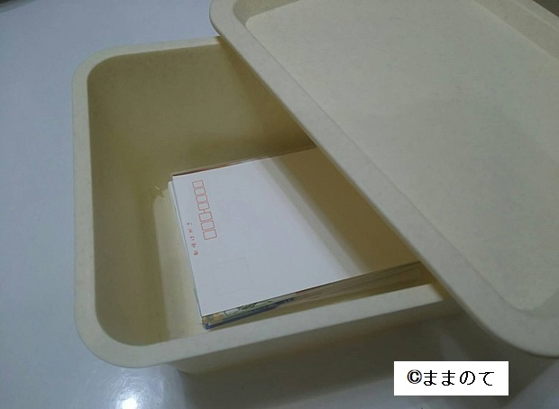 100均のスクエアボックスは文具だけではなくはがきの収納にもちょうど良く、蓋つきなので見栄えがシンプルで収納がスッキリ見えるのでおすすめですよ。