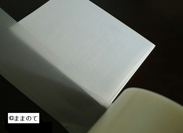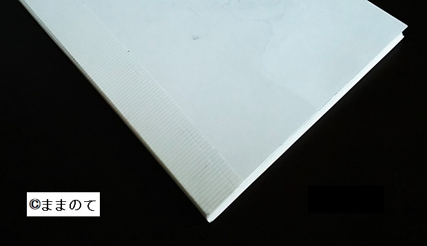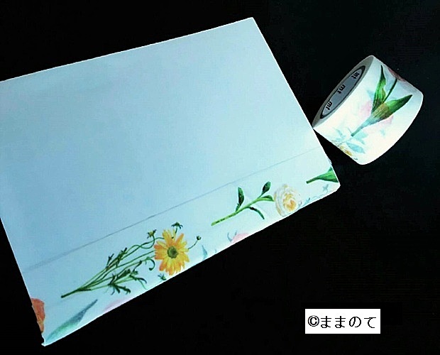 3.年賀状の側面を包むように、ガムテープを両側へ折り返して製本します。
