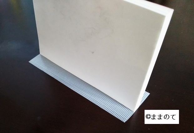 2.まとめた年賀状の側面ををガムテープののりの部分に当てて、全体にのりがくっつくように立てます。