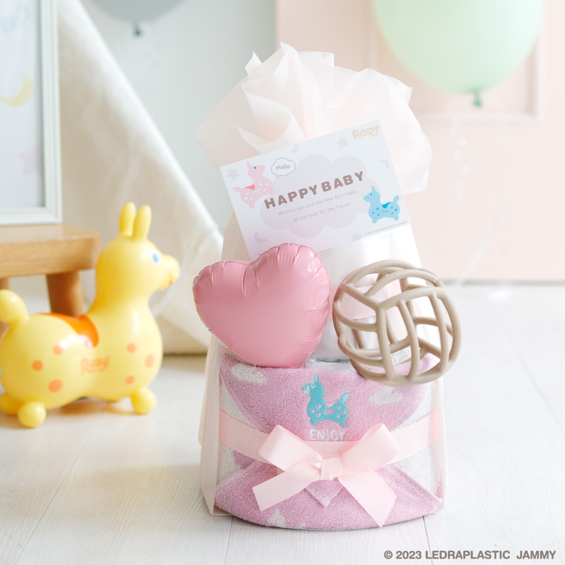 人気の絵本「はらぺこあおむし」がモチーフになったおむつケーキは、おしりふきやウェットティッシュ用のフタ、赤ちゃんが喜ぶおもちゃ、カラフルなバスタオルがついたセットです。使う人に合わせておむつのメーカーやサイズを選べるので、喜ばれることでしょう。