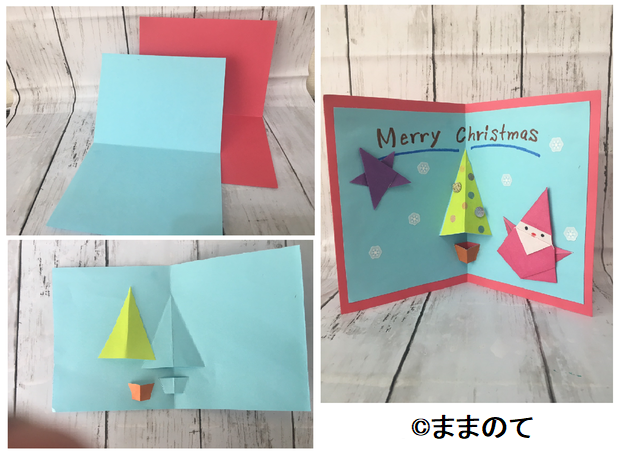 3歳頃になると、大人と一緒に折り紙で簡単なモチーフを折れる子どもが増えます。折り紙を使い、飛び出すクリスマスカードを手作りしてみてはいかがでしょうか。