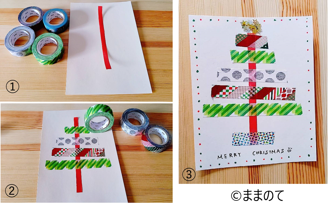 台紙にマスキングテープを貼り、クリスマスツリーを描くアイデアがあります。マスキングテープは、貼り方ひとつでさまざまな形を作ることができますよ。