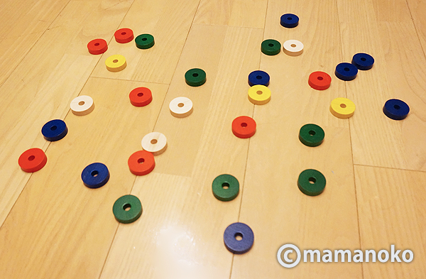 ・外食のときに、各色2個ずつと紐を持っていくだけで、食事が来るまで楽しく遊んでいてくれます。