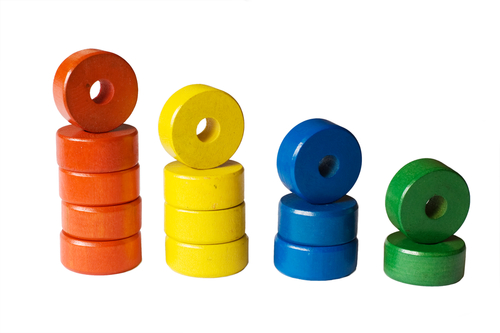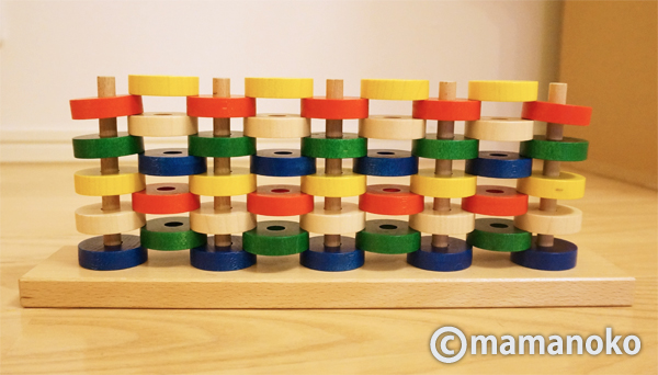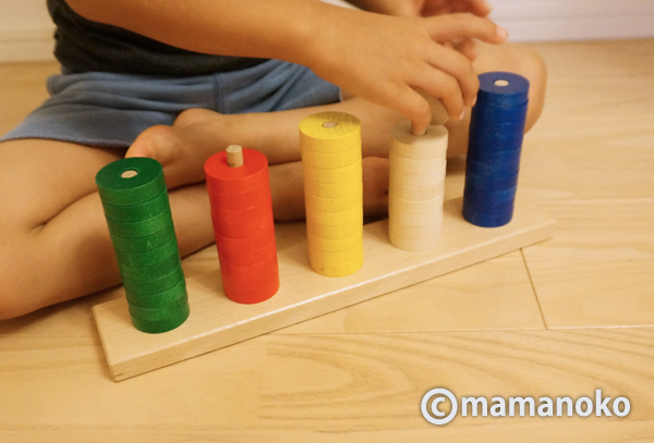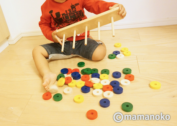 5本の棒がついた台にリングを通す遊びです。木と木が接触するパチンという音が心地良く、リングを穴に通すだけでも、十分子どもは楽しめます。はっきりした5色の色が「種類別に分けたい」という気持ちをかきたてます。