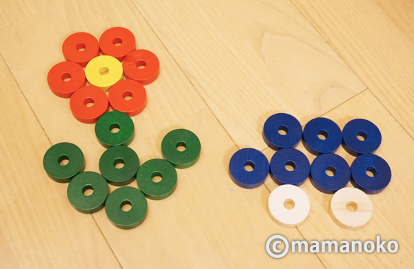 5本の棒がついた台を使わなくても遊ぶことができます。リングを平面に置き、子どもがかっこ良いと思う並べ方を楽しみます。リングを色別に縦に並べたり、円にして並べたり、車に見立てて縦列駐車させたり、発想は自由です。どんな並べ方がお気に入りなのか、ママと子どもで披露しあうのも良いでしょう。