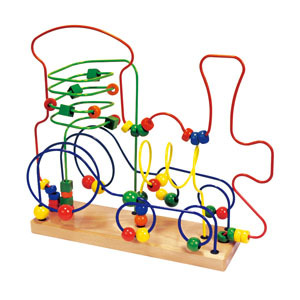 5本の木の棒がついた台に木、車、電車、標識などのパーツを通して遊ぶおもちゃです。パーツにはそれぞれ数字が書かれています。種類分け遊びや数字順に並べる遊び方ができますよ。ひももついているので、プルトイとしても遊べます。