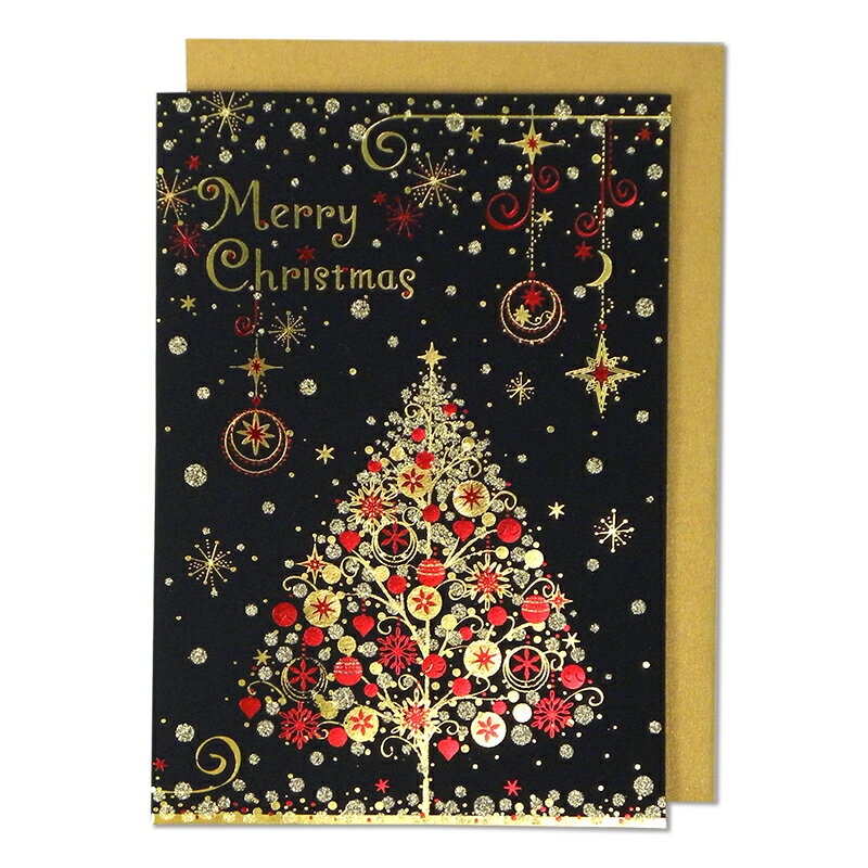 華やかなデザインの封筒付きクリスマスカードです。箔押しされたキラキラ輝くツリーの絵柄は額に入れて飾りたくなります。クリスマスカラーに彩られた絵柄を見ていると、クリスマス気分がますます盛り上がります。