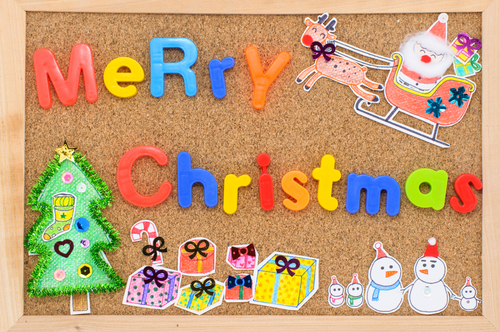 賃貸に住んでいるなどの理由から、壁に直接クリスマスの飾りをするのは気が引けるという人もいるでしょう、そんなときは、コルクボードやブラックボードを使った飾りつけがおすすめです。カラフルなモチーフを使ってコルクボード一面に装飾しても良いですし、子どもたちの絵をコルクボードに貼っても楽しいですね。