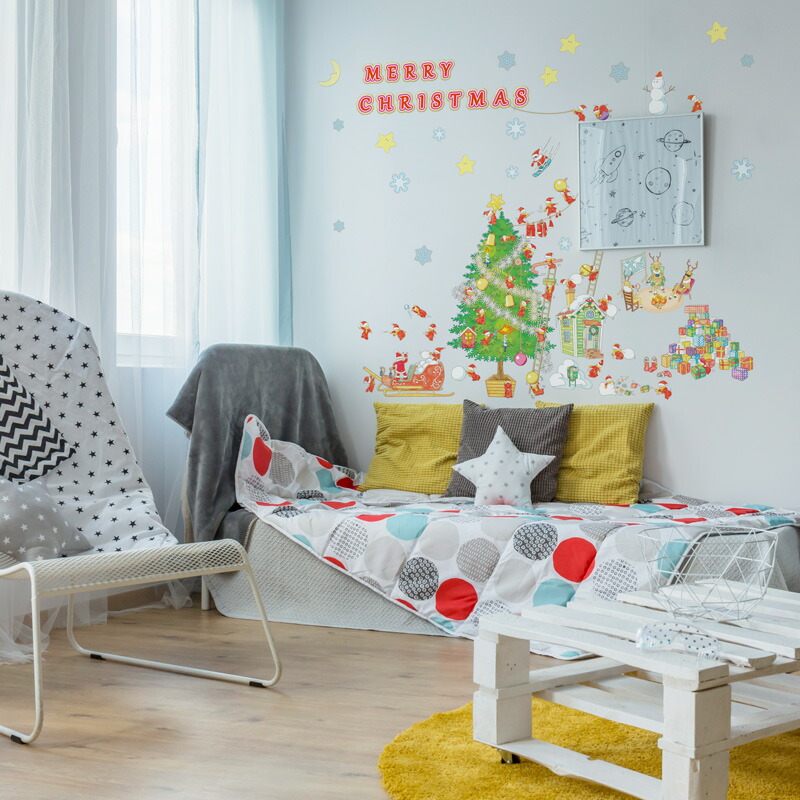 特大のサンタクロースがメインのウォールステッカーは、子どもたちが喜ぶカラフルなデザインです。壁や窓ガラス、家具やバスルームなど貼る場所を選ばないので、スペースを考えながらレイアウトしても楽しいですね。