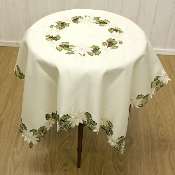 クリスマスのテーブルコーデには、ポインセチアやひいらぎが刺しゅうされたテーブルクロスも素敵ですよ。