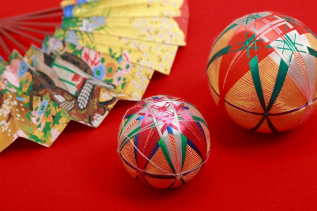 手まりの起源は平安時代の蹴鞠(けまり)にあるといわれていますが、やがてお手玉のように女の子が手で遊ぶようになりました。各地で綿が栽培され木綿の着物が普及した江戸時代中期に、織り糸の端を利用した手まり作りがはやったといわれています。