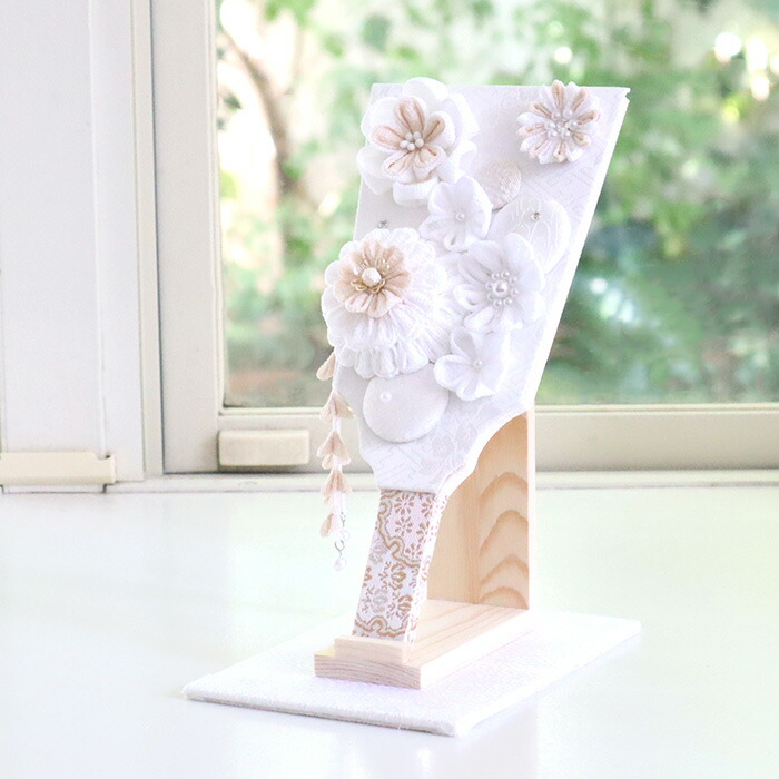 つまみ細工の花がたくさんついた、清らかで美しい羽子板です。白を基調としたデザインと、かすかに揺れる飾りが上品さを引き立たせてくれますよ。コンパクトなので、玄関先やリビングの壁飾りにもおすすめです。