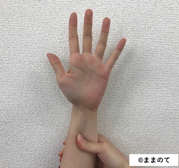手のひらを上に向けた状態で腕を伸ばしてみましょう。ツボは左右対称であることがほとんどなので、右手でも左手でも構いません。手のひら側の手首のしわがある場所に、反対側の手の薬指、中指、人指し指を順番に当てます。その人指し指の側面で、手首の中央にあるふたつの筋の間、つまり、手首のしわの中央部分から指三本分下に内関があるということになります。探すのが難しいときは画像も参考にしてみてください。