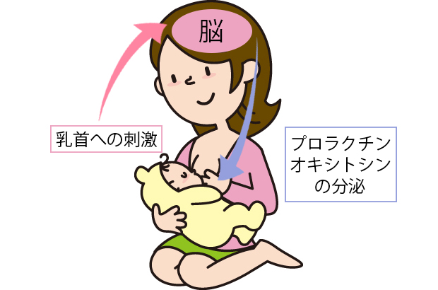 母乳を噴出させるためには、「オキシトシン」のはたらきが必要です。オキシトシンは赤ちゃんが乳首を吸う刺激によって分泌されます。母乳を乳房から積極的に押し出す、いわゆるポンプのような役割をしているのです。